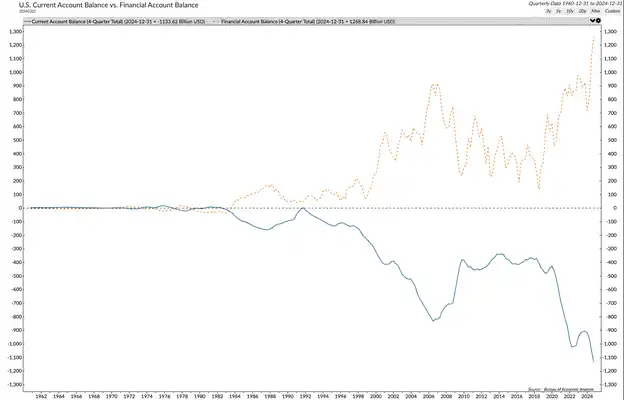 الخط المنقط البرتقالي في الرسم البياني واللوحة العلوية هي رصيد الحساب المالي الأمريكي. يتضح أنه تقريبًا صورة معكوسة لرصيد الحساب الجاري. السبب في قدرة الصين ودول التصدير الأخرى على مواصلة تحقيق فائض تجاري ضخم هو أنه عندما يكسبون الدولارات من خلال بيع السلع لأمريكا، فإنهم لا يعيدون استثمار هذه الدولارات في الداخل. يعني ذلك أنهم يضطرون لبيع الدولارات لشراء عملتهم المحلية مثل اليوان، مما يؤدي إلى ارتفاع قيمة العملة المحلية، وبالتالي زيادة أسعار السلع المصدرة. على العكس، يقومون باستخدام هذه الدولارات لشراء سندات الخزانة الأمريكية والأسهم الأمريكية. وهذا يمكّن أمريكا من الحفاظ على عجز كبير دون الإضرار بسوق السندات، ويمتلك أفضل سوق أسهم عالمي على مدى العقود الماضية.