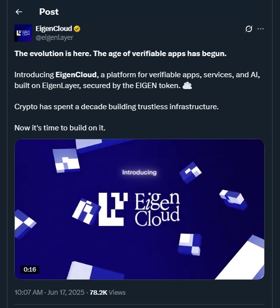 بعد عام من التطوير ، ظهرت ** EigenCloud ** كمنصة أساسية في نظام EigenLayer البيئي . يسمح لأي تطبيق - سواء كان على السلسلة أو خارج السلسلة - بالوصول إلى الخدمات المستقلة التي يمكن التحقق منها ، ** مما يتيح مستويات جديدة من الشفافية والثقة. فهو يجمع بين البدائيين مثل EigenDA لتوافر البيانات ، و EigenVerify لحل النزاعات ، و EigenCompute لتنفيذ العمليات المعقدة ، وكلها مدعومة برمز EIGEN.