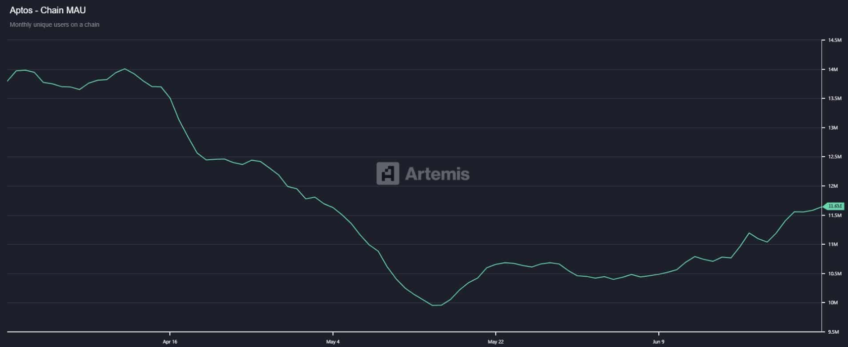 وفقًا لبيانات Artemis، شهد عدد المستخدمين النشطين شهريًا (MAU) وحجم المعاملات داخل السلسلة انتعاشًا. بشكل أكثر تحديدًا، بعد انخفاض كبير في مايو، عاد عدد المستخدمين النشطين شهريًا إلى 11.6 مليون، وهو أعلى مستوى له منذ أكثر من شهر. في نفس الوقت، بلغ إجمالي حجم المعاملات 5.3 مليون، وهو أعلى مستوى له منذ فبراير 2025.