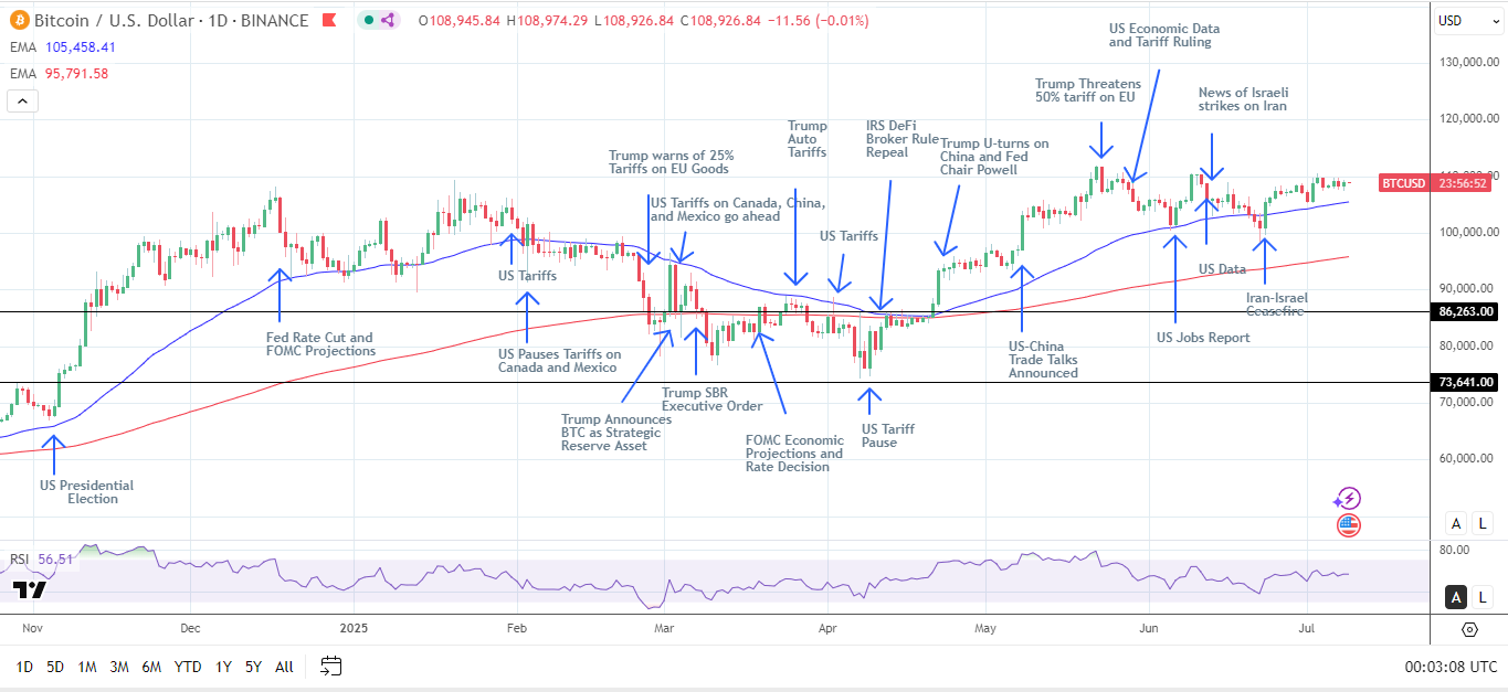 مع تحول التركيز من الرسوم الجمركية الأمريكية إلى الأصول الرقمية، ارتفع بيتكوين (BTC) أيضًا. ستقوم مجلس النواب بمناقشة 3 تشريعات رئيسية للأصول الرقمية: “قانون CLARITY”، “قانون GENIUS” و"قانون مكافحة مراقبة الدولة للعملات الرقمية للبنك المركزي" (Anti-CBDC Surveillance State Act). على الرغم من أن المشرعين سيصوتون على هذه القوانين خلال الأسبوع الذي يبدأ في 14 يوليو (أسبوع الأصول الرقمية)، إلا أن جلسة الاستماع التي عقدتها لجنة البنوك في مجلس الشيوخ اليوم (9) لها أيضًا أهمية كبيرة.