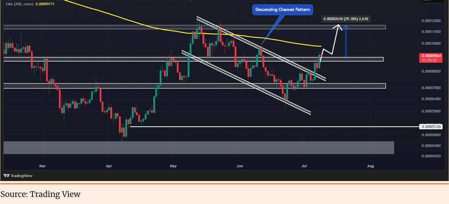 وفقًا للتحليل الفني، فإن FLOKI حاليًا في اتجاه صاعد، وقد يقترب من حدوث انتعاش كبير. تُظهر الرسم البياني اليومي أن FLOKI قد نجح في اختراق نمط القناة الهابطة، وتجاوز مستوىًا رئيسيًا $0.000088. هذا الاختراق يفتح الطريق لمزيد من الارتفاع.