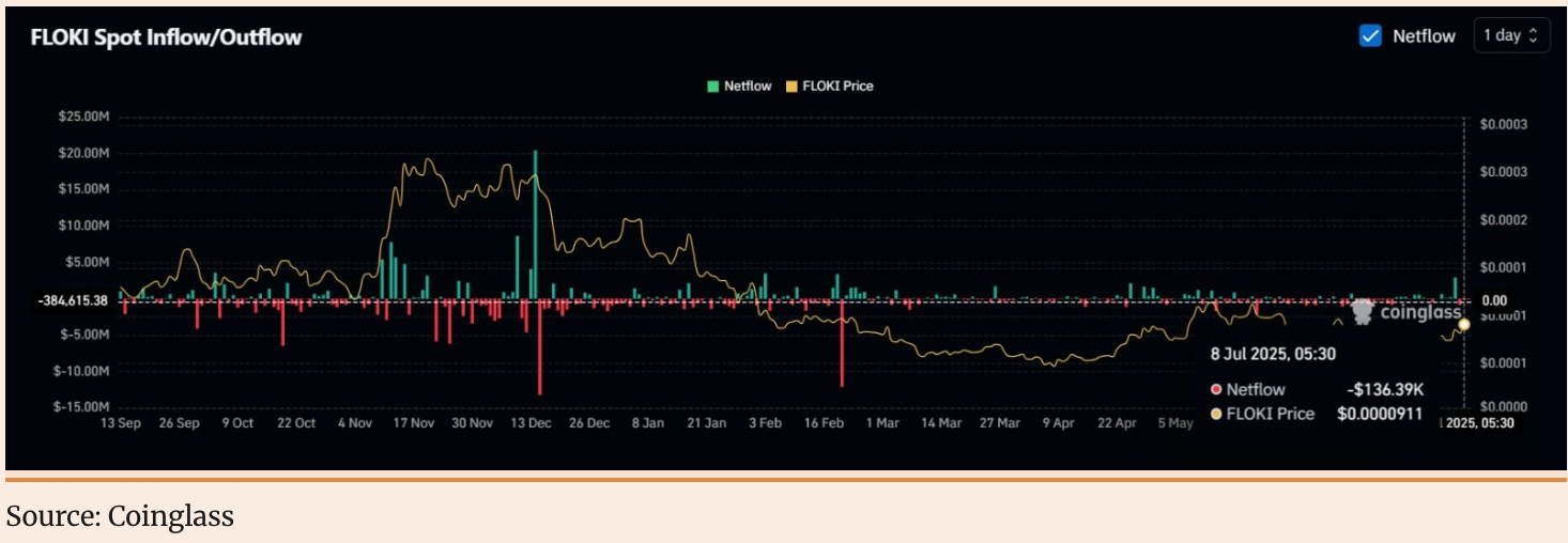 أداة تحليل السلسلة Coinglass تظهر أن السوق تشهد مشاعر صاعدة تجاه FLOKI. خلال الـ 48 ساعة الماضية، كان هناك تدفق قيمته 250,000 دولار من FLOKI في البورصات، مما يدل على تراكم كبير للأموال. مثل هذه الأنشطة في السوق عادة ما تنذر بزيادة ضغط الشراء، مما قد يؤدي إلى مزيد من ارتفاع الأسعار.