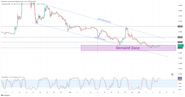 على الرغم من أن عملة Pi حاولت التعافي على المدى القصير، إلا أن الاتجاه العام للأسعار لا يزال يظهر اتجاهًا هبوطيًا طويل الأمد. تواصل عملة Pi التداول داخل قناة هبوطية، وقد ظلت هذه القناة مستقرة منذ النقطة العالية الأخيرة. حاليًا، تتعافى الأسعار من منطقة الطلب الرئيسية بالقرب من 0.4400 دولار إلى 0.4700 دولار.
