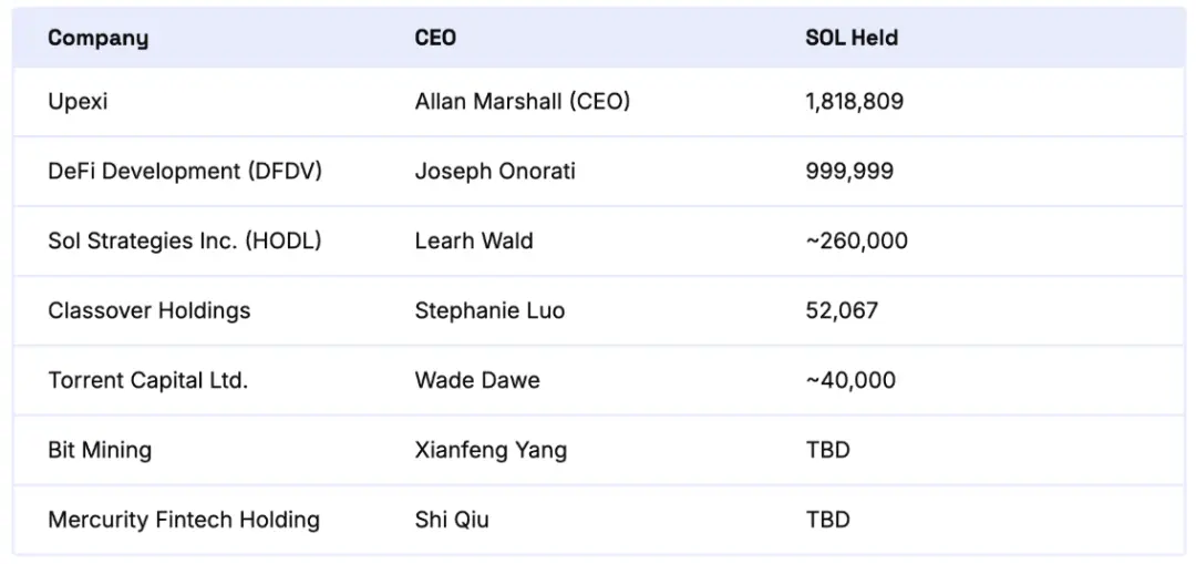 حتى الآن، بدأت 8 شركات في الاحتياطي الاستراتيجي لعملة SOL، حيث تم تخزين أكثر من 3 ملايين عملة SOL، مع وجود أكبر كمية احتياطي من Upexi و DeFi Development.