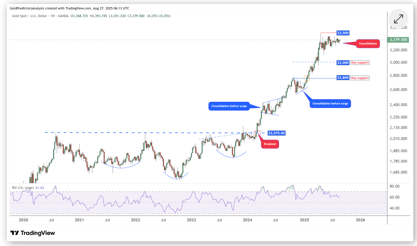 【الذهب يشكل مثلث صاعد، وكسر 3500 دولار أو يفتح ارتفاعًا جديدًا】