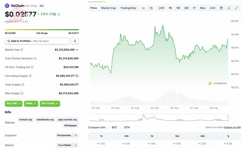 يبدو أن سعر VeChain (VET) يتعافى من انخفاض حاد في السوق مؤخرًا. وفقًا لبيانات CoinGecko، فقد ارتفع سعر VET بنسبة 4.1% في آخر 24 ساعة، و7.6% في المخططات الأسبوعية، و2% خلال الشهر السابق، و9.2% منذ أغسطس 2024. على الرغم من موجة الصعود، لا يزال VET منخفضًا بنسبة 1.4% في المخططات التي تمتد لـ 14 يومًا.