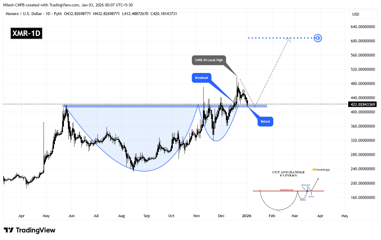 على الإطار الزمني اليومي، كان XMR يتجمع ضمن نمط كوب ومقبض معرف جيدًا — وهو تكوين استمراري صعودي كلاسيكي يسبق غالبًا حركات صعودية قوية بمجرد تجاوز خط العنق.