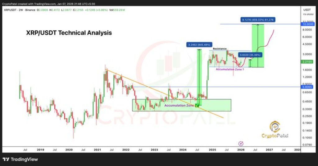 النقاش حول $10 ليس عن الغد أو الأسبوع المقبل. يصبح ذا صلة فقط إذا تجاوز XRP مستوى 3.50 دولارات وأكد قبوله فوقه. على المخطط، هناك مقاومة قليلة نسبيًا بين تلك المنطقة والمستويات الأعلى بكثير.