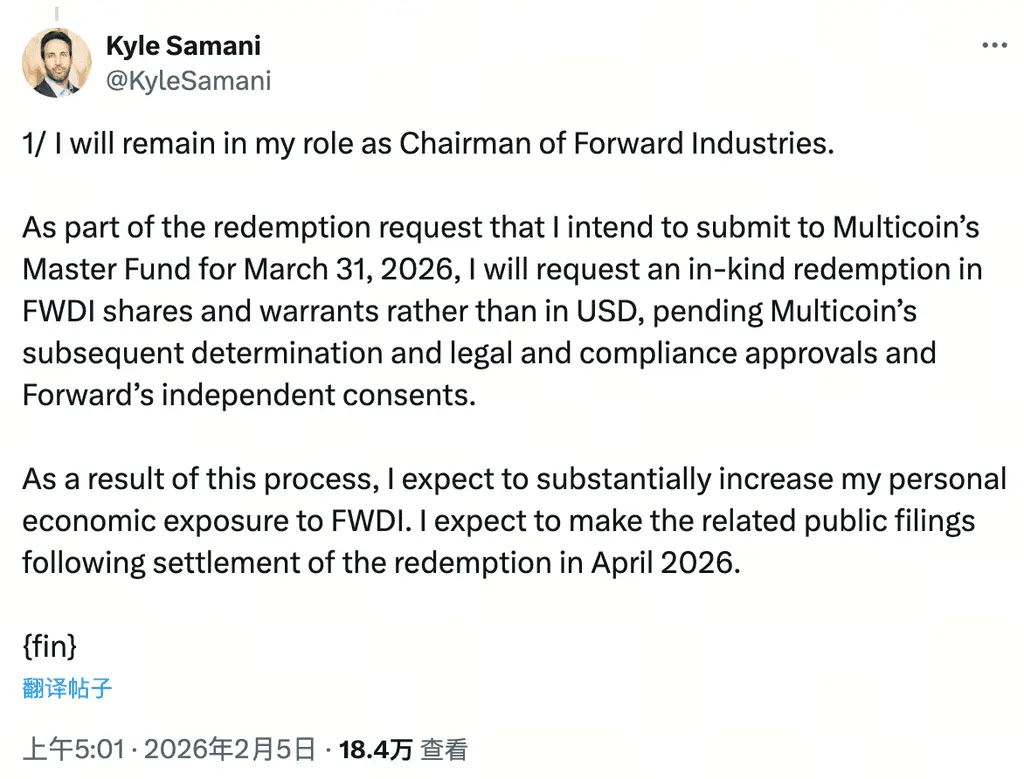 رحيل ساماني لا يعني انسحابه التام. أوضح أنه سيواصل الاستثمار في صناعة التشفير بشكل شخصي، وسيظل يدعم Solana بيئيًا. أول دوره المهم بعد تركه هو الاستمرار في رئاسة مجلس إدارة شركة Forward Industries، وهي شركة مدرجة فريدة من نوعها، واستراتيجيتها الأساسية هي الاحتفاظ وإدارة أصول Solana الضخمة كمخزون احتياطي.