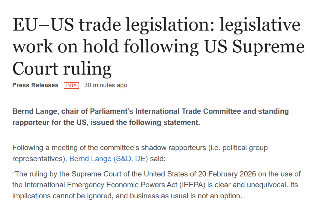 وفقًا لتقارير وسائل الإعلام مثل CCTV والأخرى، ومع تعرض سياسة الرسوم الجمركية الأمريكية لتغيرات كبيرة، أعلن البرلمان الأوروبي يوم الاثنين عن تعليق إجراءات الموافقة على اتفاقية التجارة بين أوروبا وأمريكا.