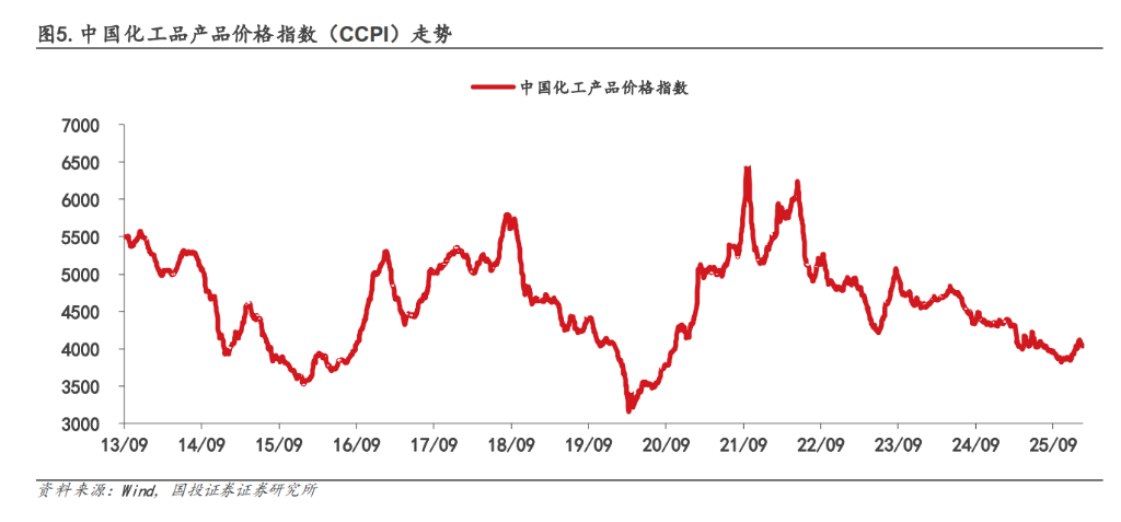 على مستوى السعر، تم الإبلاغ عن مؤشر أسعار المنتجات الكيميائية في الصين (CCPI) عند 3,930 نقطة في 31 ديسمبر 2025، بانخفاض 39٪ عن أعلى نقطة في 2021، وهو في المعدل البالغ 23٪ خلال السنوات الخمس الماضية.**لقد دخل في نطاق تاريخي منخفض.**على مستوى الأرباح، في الأرباع الثلاثة الأولى من عام 2025، حقق قطاع الكيماويات الأساسية صافي ربح يعزى إلى الشركة الأم بقيمة 112.7 مليار يوان، بزيادة سنوية بنسبة 7.5٪.استقر قطاع العرض في البداية.