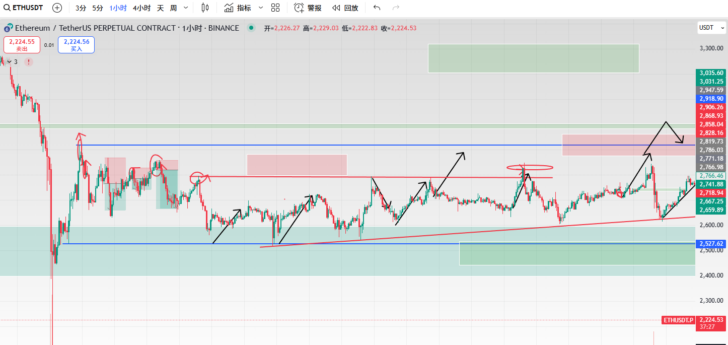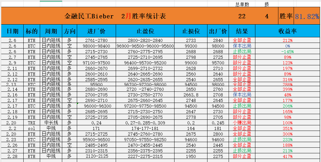 في بداية فبراير، انخفض سعر BTC إلى 9w وسعر ETH إلى 2100، 2100 هو مستوى الدعم الأسبوعي لإثيريوم، والدعم واضح ومستوى كبير، بينما يبعد الدعم الأسبوعي الرئيسي لـ BTC 7.3w عن بعد كبير، كنا نركز في عقود فبراير على إثيريوم، بعد أن انخفضت الأسعار إلى 2100 وارتدت بسرعة إلى 2900، اخترنا الدخول بنية تصاعدية متعددة في منطقة 2530-2600 بعد العديد من المرات. حققنا نتائج جيدة