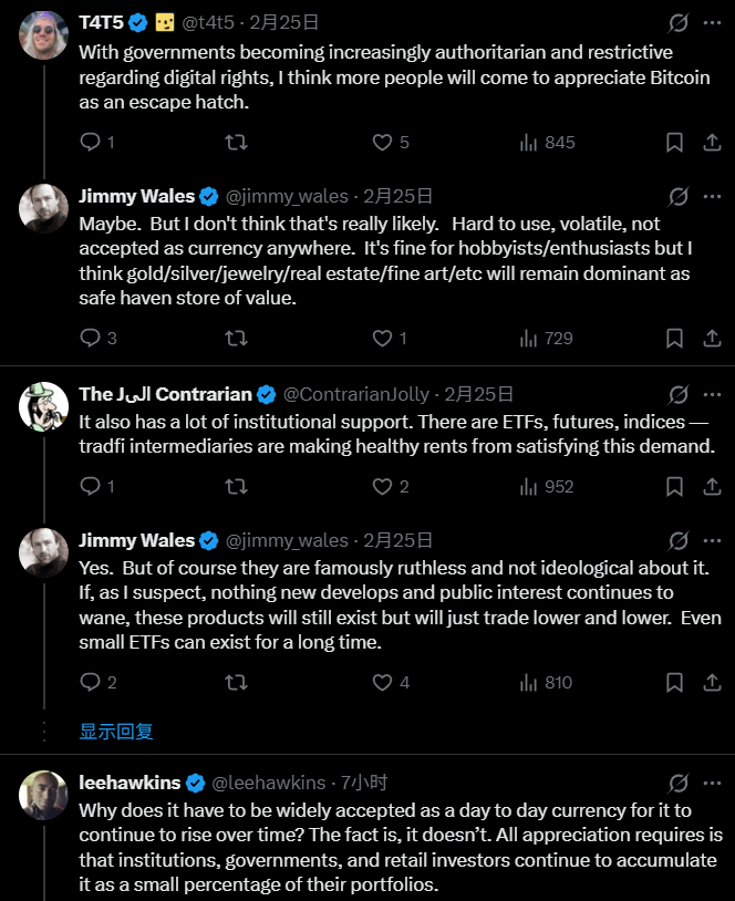 Doch Wales’ Beitrag löste schnell eine Welle der Ablehnung bei Bitcoin-Anhängern aus. Viele konterten, dass Bitcoin angesichts des globalen Inflationsdrucks seine Rolle als knappes digitales Asset bewiesen habe. Einige veröffentlichten sogar historische Kursdiagramme oder Screenshots ihrer Gewinne durch Bitcoin-Investitionen, um Wales’ Ansicht zu widerlegen. Andere teilten ihre Erfahrungen, wie sie langfristig Bitcoin gehalten und damit gelebt haben, und kritisierten Wales’ Einschätzung als veraltet. Einige Kommentatoren wiesen auch darauf hin, dass Wales absichtlich das Jahr 2050 gewählt hat, um eine Prognose zu machen, die kurzfristig nicht überprüfbar ist, und so der aktuellen Marktstimmung nach dem positiven Durchwinken des Spot-ETFs für Bitcoin zu entgehen.