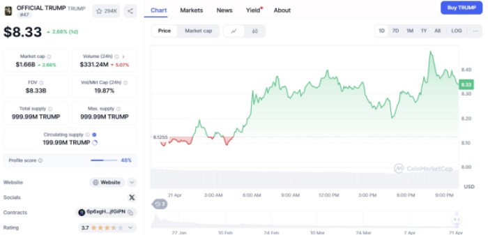 Además, a partir del 20 de abril, comienza un evento de desbloqueo diario en $TRUMP, donde se desbloqueará el 0.049% del suministro total de 1B tokens cada 24 horas hasta abril de 2028. La capitalización de mercado actual de $TRUMP es de $1.66B, y el precio del token es de $8.30.