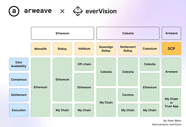La modularidad divide la cadena de bloques en una capa de disponibilidad de datos, una capa de consenso, una capa de liquidación y una capa de ejecución, y podemos tomar prestada esta forma para ver más claramente lo que Arweave y SCP han logrado exactamente. A diferencia de lo que Celestia y los Sovereign Rollups quieren lograr y ya están en marcha, Arweave y SCP ya están un paso por delante, y los desarrolladores pueden desarrollar dapps en Arweave y SCP de inmediato.