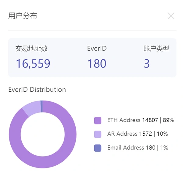 everPay cuenta actualmente con más de 16.000 usuarios, y sus tipos de cuentas se dividen en tres categorías: direcciones ETH, direcciones AR y direcciones de correo electrónico (implementadas por EverID), de las cuales **las direcciones ETH representan el 89% y son la principal fuente de usuarios. **