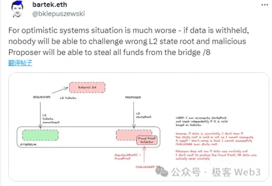 **El secuenciador/proponente puede conspirar con los nodos de la capa DA bajo la cadena ETH para actualizar el stateroot en la Capa1, pero los parámetros de entrada correspondientes a la transición de estado se retienen y no se envían, lo que hace imposible que los externos juzguen si el nuevo stateroot es correcto, lo que se convierte en “ojos abiertos” ciegos". **