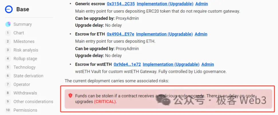 (Los retrasos en la actualización del contrato de diferentes proyectos Layer2 están marcados en L2BEAT. La mayoría de los contratos L2 pueden ser actualizados inmediatamente por el controlador. Si el controlador del contrato quiere robar activos, o su clave privada es robada por un pirata informático, los activos del usuario alojados por L2 definitivamente sufrirá)
