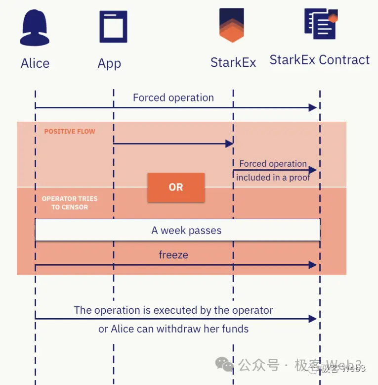 Algunos Ethereum Layer 2, como Loopring, StarkEx, dYdX, Degate, etc., configurarán una función de activación de cabina de escape/retiro forzado resistente a la censura en la Capa 1. Tomando Starknet como ejemplo, si el usuario envía Forzado en la Capa 1 Si la solicitud de retiro no recibe una respuesta del secuenciador Layer2 al final del período de ventana de 7 días, la función de solicitud de congelación se puede llamar manualmente para poner L2 en el estado congelado y activar el modo de cabina de escape.