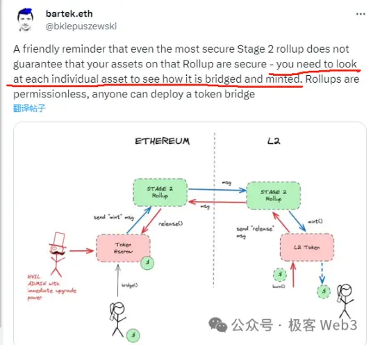 Para Ethereum Layer 2, siempre que el funcionario de Layer 2 pueda actualizar rápidamente el contrato en la cadena de Layer 1, el token bloqueado en la dirección de depósito y retiro del puente oficial L2 puede, en teoría, ser robado, sin importar cuán confiable sea su capa DA o su sistema de certificación. es.