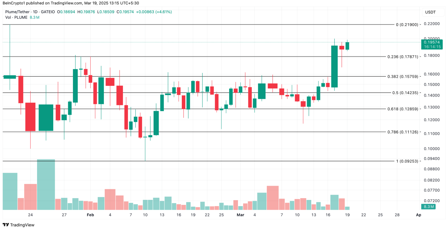 PLUME, una moneda perteneciente al ámbito de RWA, se encuentra entre las altcoins con mayor tendencia al alza hoy. Actualmente, PLUME se está negociando alrededor de $0,19, con un aumento del 12% en las últimas 24 horas.