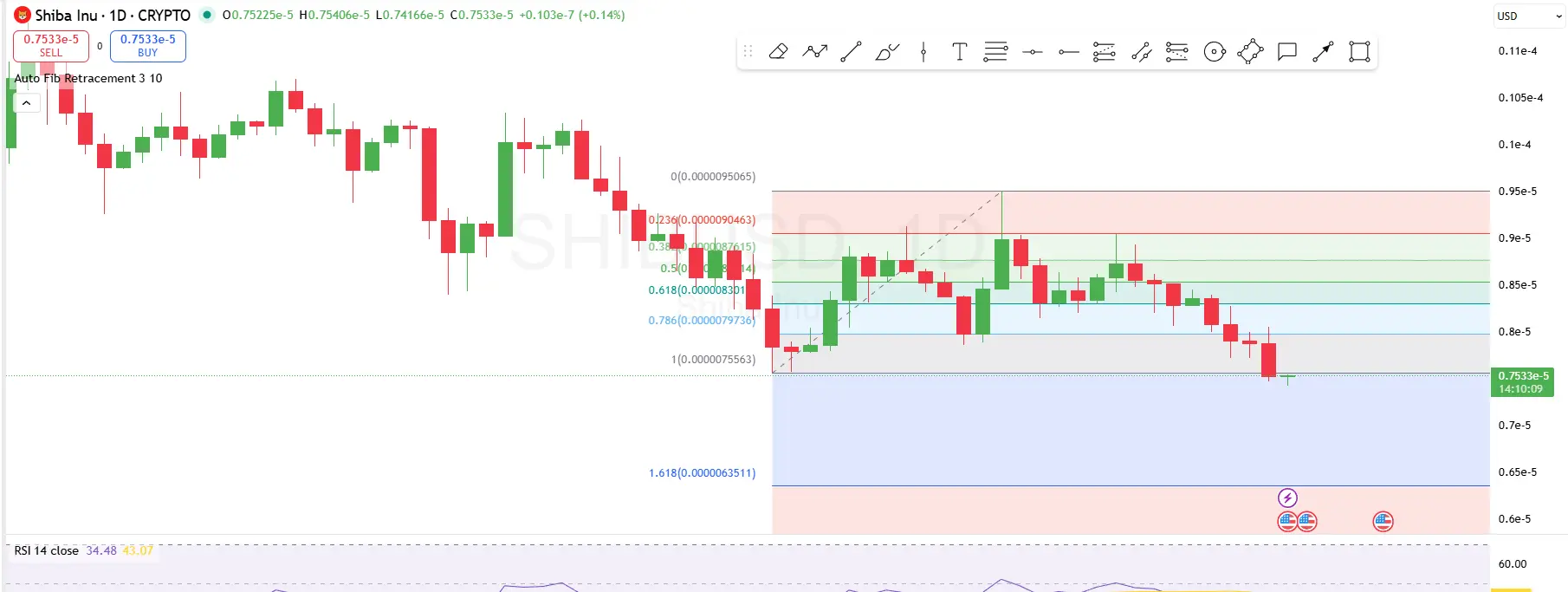 Si la tendencia se invierte al alza, la resistencia inmediata para Shiba Inu se sitúa alrededor del nivel Fibonacci 0.786 cerca de $0.00000797, donde el precio ha enfrentado rechazo anteriormente. Un movimiento fuerte por encima de esta resistencia podría señalar una recuperación potencial hacia niveles de retroceso superiores, como 0.618 en $0.00000830.