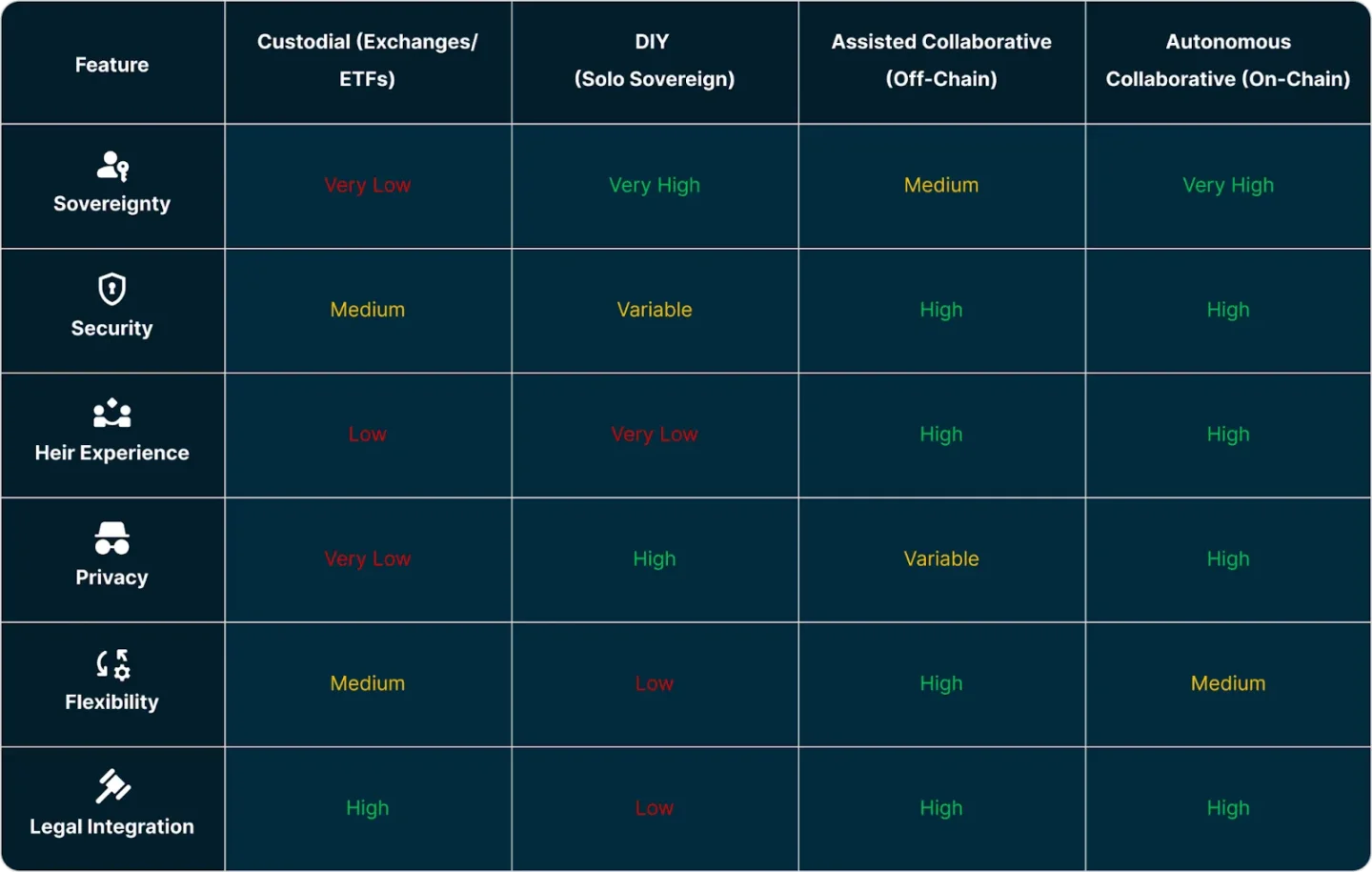 Un esquema de custodia da confianza, pero implica dependencia institucional. Un esquema DIY puede ser excelente en manos expertas, pero exige mucho a propietarios y herederos. La herencia colaborativa off-chain mejora usabilidad y flexibilidad. La herencia en la cadena añade una protección duradera y confiable.