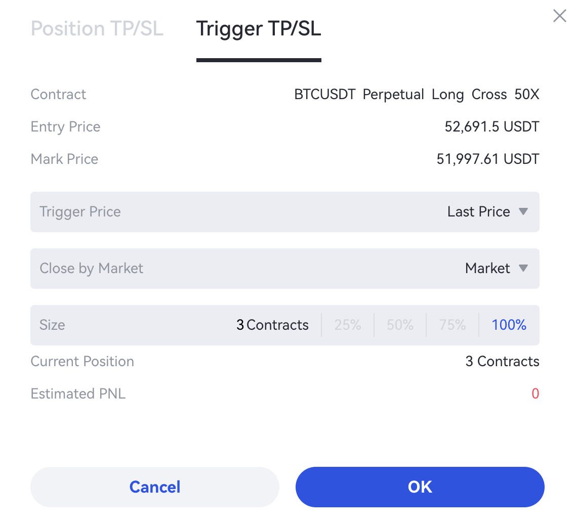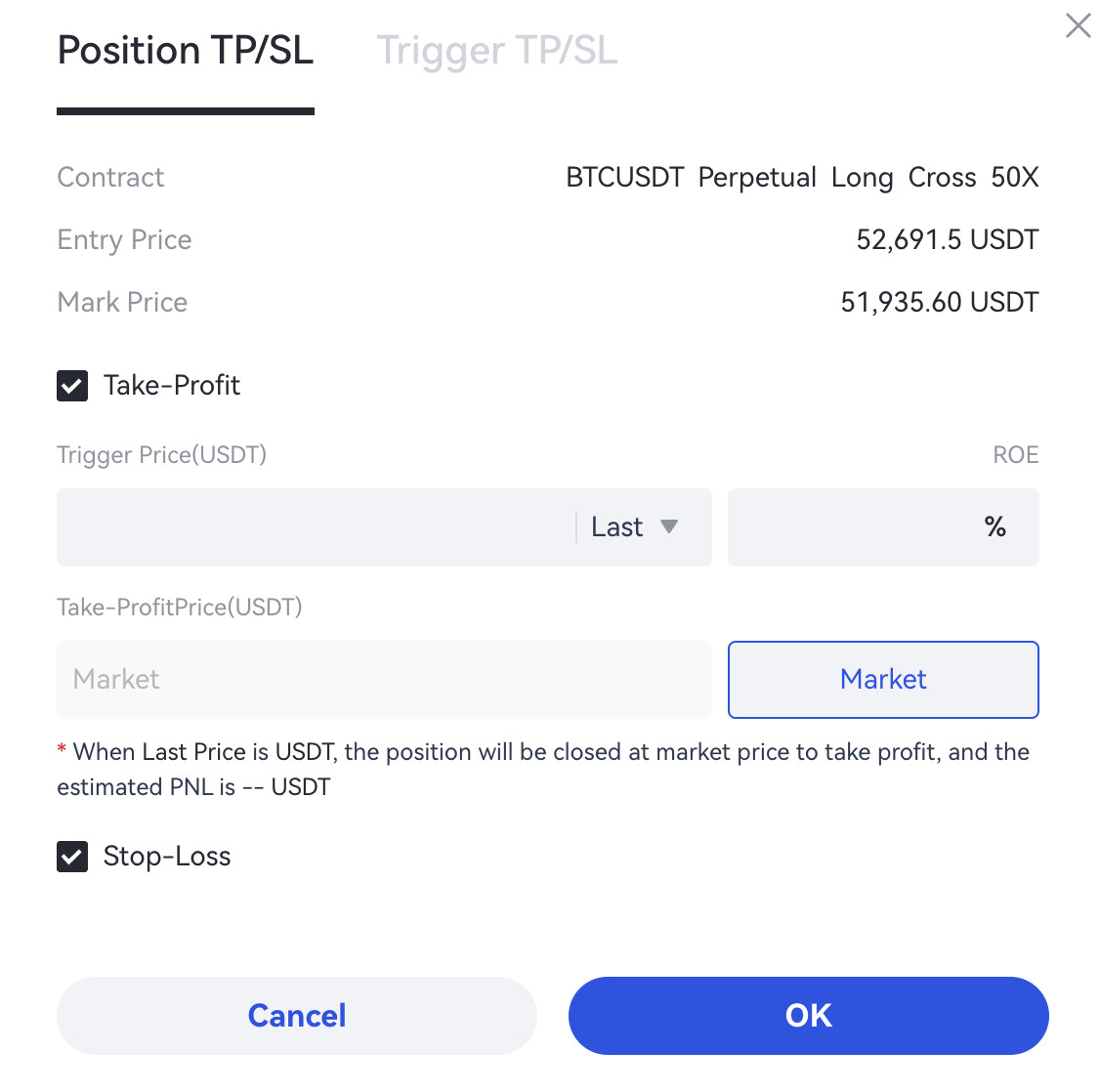 Par exemple, supposons que vous achetiez un contrat BTC au prix de 50 000 USDT avec un effet de levier de 10x. Dans ce scénario, si le prix du marché du BTC augmente jusqu'à 55 000 USDT, vous pouvez définir un ordre take-profit pour clôturer automatiquement la position, sécurisant ainsi un profit à 50 000 USDT. De même, si le cours chute à 48 000 USDT, un ordre stop-loss peut automatiquement clôturer la position lorsque le dernier cours atteint 48 000 USDT, limitant ainsi votre perte à 20 000 USDT.