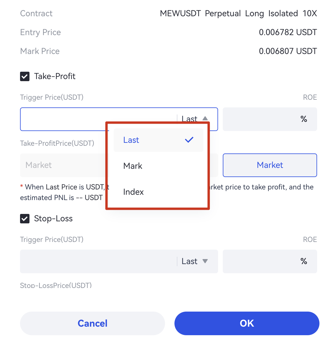 Lorsque le dernier cours du marché (qu'il s'agisse du dernier cours, du cours de référence ou du cours de l'indice) atteint le prix de déclenchement spécifié, le système passe automatiquement un ordre en fonction du type d'ordre, du prix et du montant prédéfinis. TP/SL aide les traders à gérer les risques dans un marché volatil et à garantir la sécurité de leurs transactions.