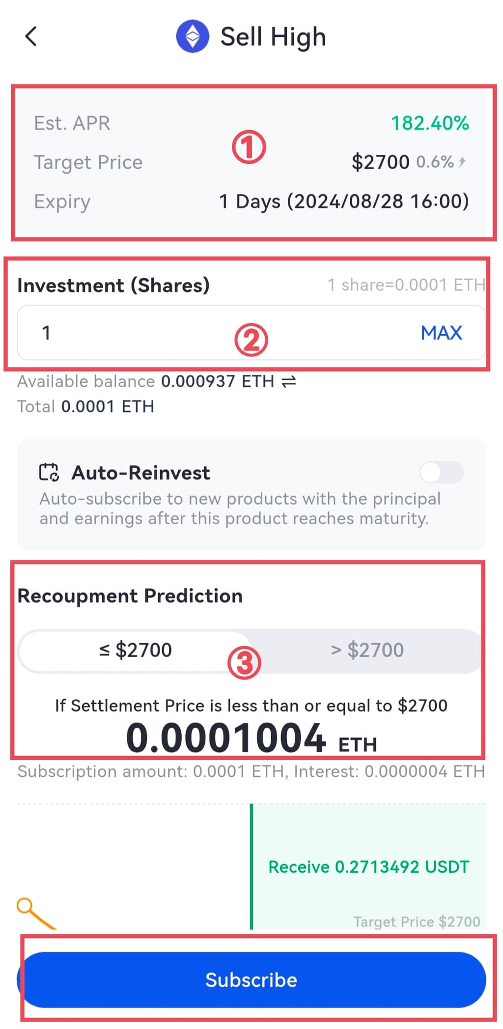 ③ Une prédiction de récupération s'affichera rapidement après la saisie du montant de l'investissement.