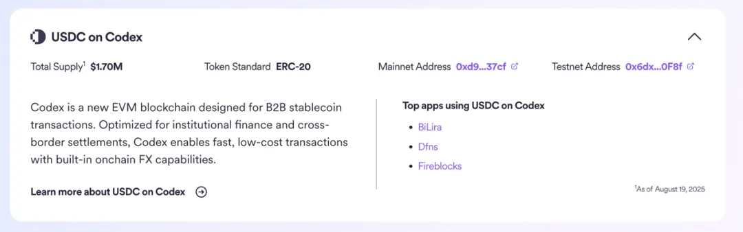 La USDC native de la chaîne Codex est maintenant en ligne et supportée par CCTP v2, avec un volume circulant d'environ 1,7 million de dollars. Cependant, des sites d'agrégation de données comme DefiLlama n'ont pas encore listé Codex en tant que chaîne indépendante, donc il n'y a pas de statistiques comparables telles que le “DeFi TVL”. Cela est également cohérent avec le positionnement de Codex qui se concentre sur les règlements B2B et les voies de conformité, plutôt que sur la liquidité DeFi généralisée.