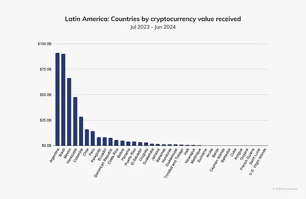 阿根廷加密货币市场展现出显著的活跃度与交易规模。根据 Chainalysis 数据显示,2023 年 7 月至 2024 年 6 月期间,该国数字资产交易额近 910 亿美元,较上年增长 6.7%。这一强劲表现推动阿根廷在 2024 年全球加密货币交易量排名中跃居第13位。