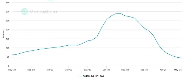 阿根廷的经济叙事始终伴随着深刻的结构性不稳定性,其本国货币阿根廷比索 (peso) 数十年来持续承受着两位数的高通胀率。这种波动性在 2024 年 4 月达到惊人峰值,通胀率同比飙升至 289.4%。尽管如此,在哈维尔·米莱总统政府实施激进经济改革(如“休克疗法”)的推动下,阿根廷通胀率与比索贬值在 2024 至 2025 年间显著回落。截至 2025 年中期,年度通胀率已大幅下降,2025 年 5 月公布的数据显示该月通胀率为 43.5%。