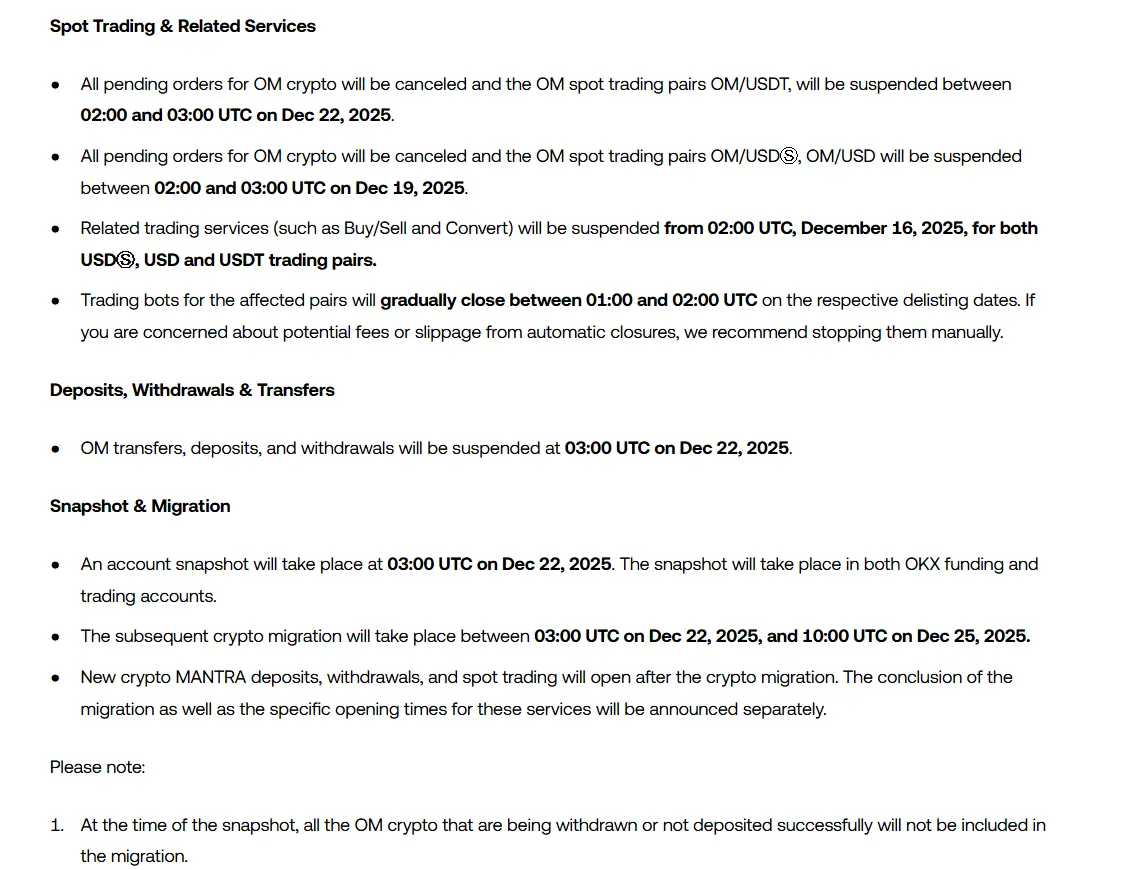 OKX a indiqué que la migration aurait lieu entre le 22 et le 25 décembre. La proposition de gouvernance de Mantra, en revanche, précise que la migration n’aura lieu qu’après la dépréciation au 15 janvier du token OM basé sur Ethereum (ERC-20).