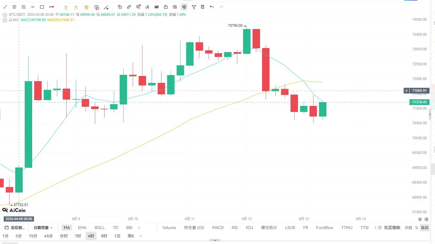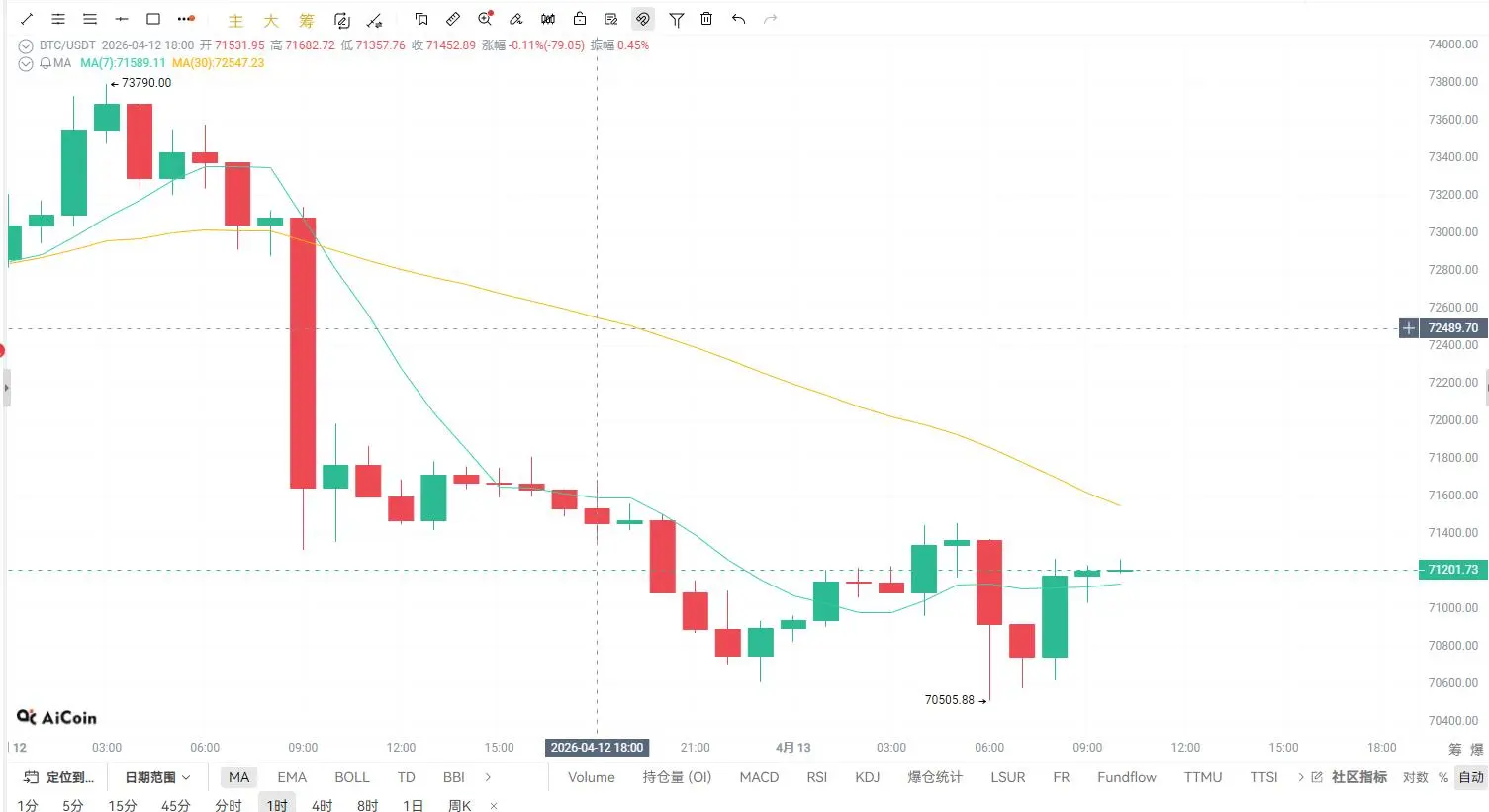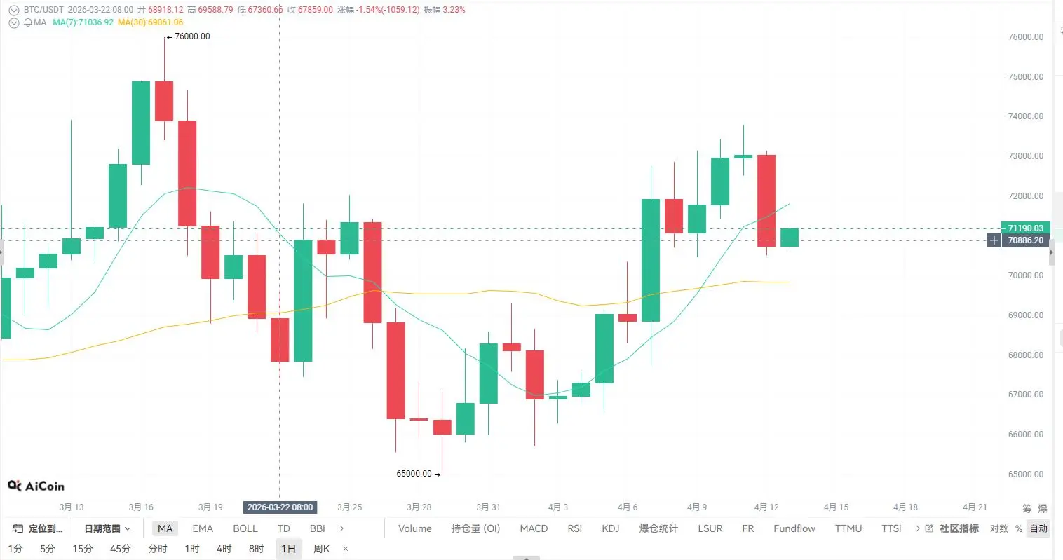 Actuellement, le prix évolue autour de MA7, la MA30 (environ 72500) exerce une résistance supérieure, la tendance à court terme est passée d’une force à une consolidation.