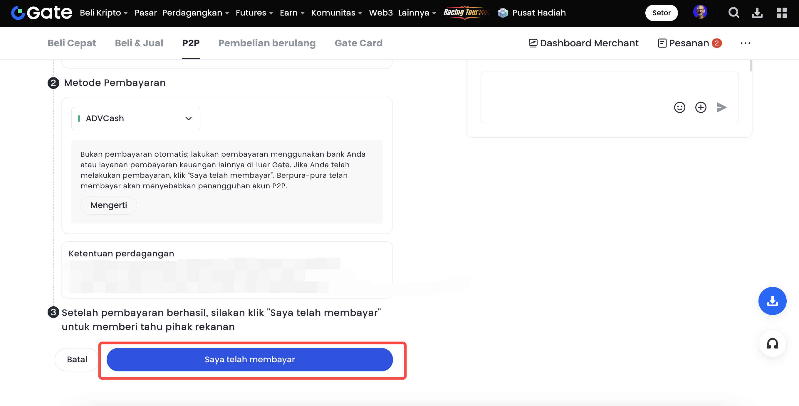 Note: Not an automatic payment. Please make the payment using your bank or other financial payment services outside of Gate. When you have made the payment, click "I have paid". Pretending to have paid the seller will lead to P2P account suspension.