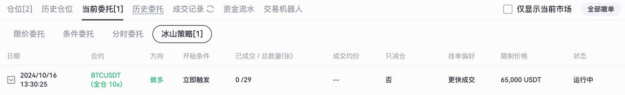 掛單成功後,可在交易頁面下方的【當前委託】-【冰山策略】中,查看當前待激活或運行中的訂單,已經完全成交或撤銷的訂單可在【委託歷史】中查看,已成交的部分可以進入冰山策略詳情頁進行查看。