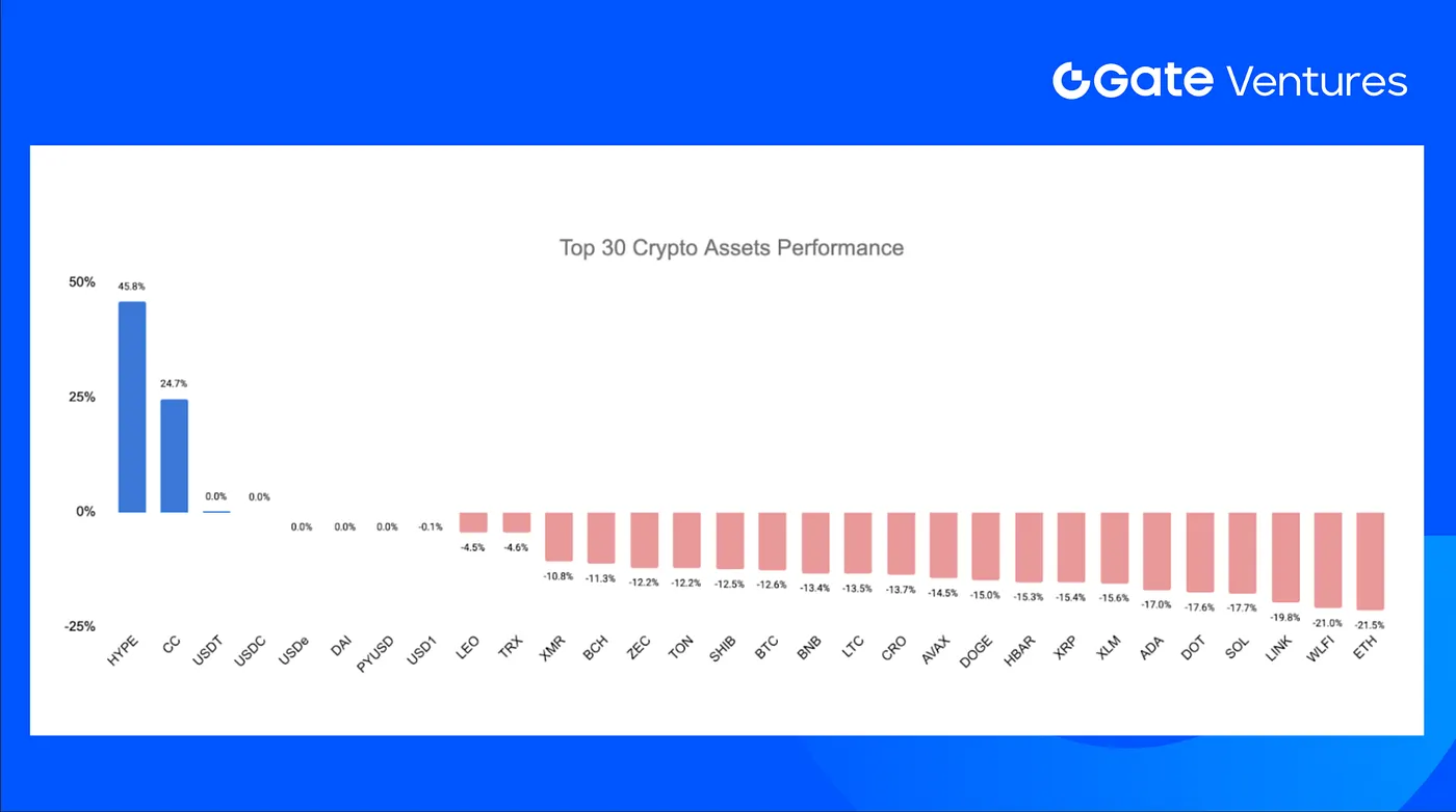 Di antara 30 aset kripto teratas berdasarkan kapitalisasi pasar, harga rata-rata turun 8,5%, hanya Hyperliquid dan Canton Network yang mencatatkan kenaikan.