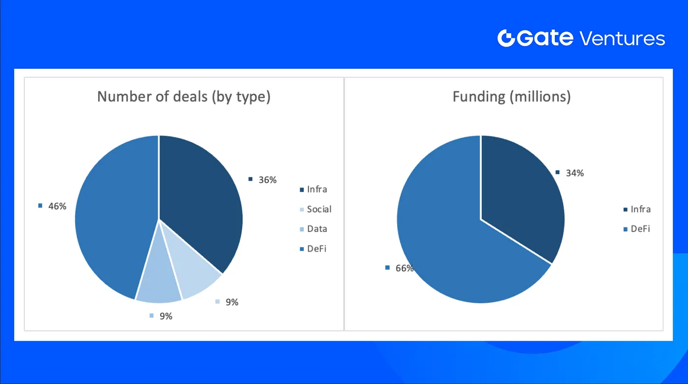 Jumlah kesepakatan yang ditutup pekan lalu sebanyak 11, dengan DeFi mendominasi 5 kesepakatan (46% dari total). Sementara itu, Infra mencatat 4 kesepakatan (36%), Social 1 kesepakatan (9%), dan Data 1 kesepakatan (9%).