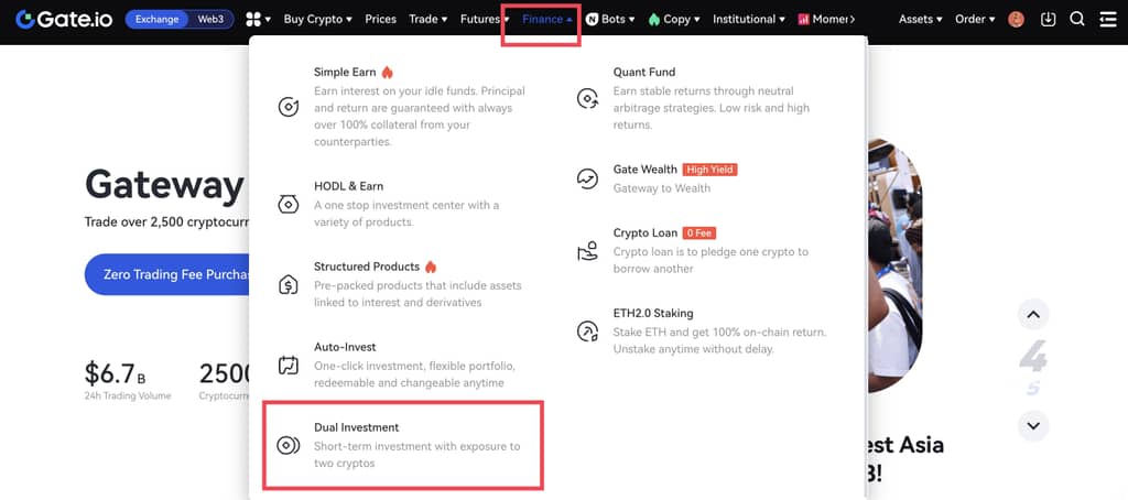 1. Jika Anda adalah pengguna Gate, silakan masuk ke akun Gate Anda;jika tidak,Anda harus daftar di Gate terlebih dahulu。Setelah itu,klik “Keuangan” – “Investasi Ganda” untuk masuk ke halaman produk Mata Uang Ganda。