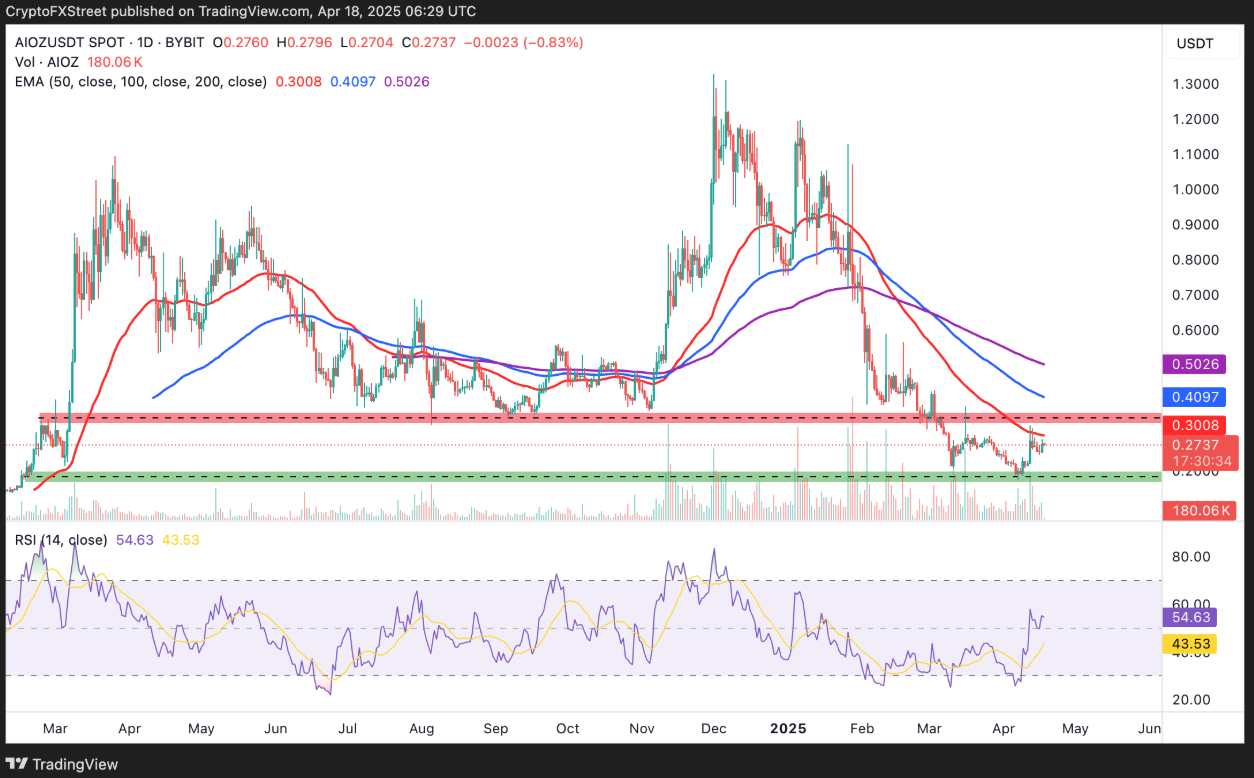 Pada saat artikel ini ditulis, AIOZ diperdagangkan di sekitar $0,27, mencatat penurunan 1,27% dalam 24 jam terakhir. Tekanan untuk mengambil keuntungan telah sedikit menahan pemulihan baru-baru ini, terutama ketika harga mendekati level teknis yang penting. Secara spesifik, garis EMA 50 hari di $0,30 serta zona resistensi kunci di $0,35 – yang sebelumnya merupakan dukungan jangka panjang – berperan sebagai penghalang psikologis yang membuat banyak trader memilih untuk bertindak lebih awal.