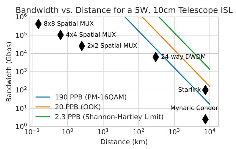 Saat ini, satelit Starlink sudah mampu menggunakan laser dengan kecepatan 100 Gbps. China juga mengembangkan teknologi komunikasi laser 100 Gbps, tetapi belum cukup untuk memenuhi kebutuhan bandwidth cluster komputasi yang mungkin membutuhkan 10 Tbps atau bahkan 100 Tbps. Menambah jumlah terminal laser akan meningkatkan bobot dan biaya satelit.