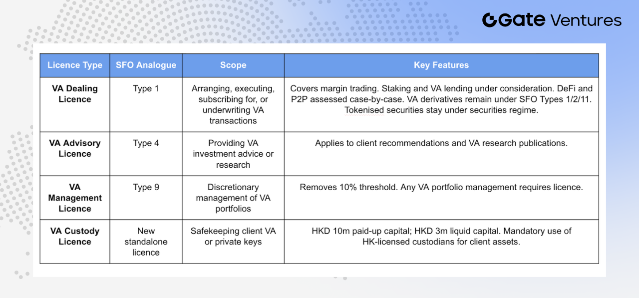 Virtual Asset Management License (VA Management): Modeled after SFO Type 9, this license covers discretionary management of virtual asset investment portfolios. A key regulatory change is the removal of the previous 10% de minimis threshold.