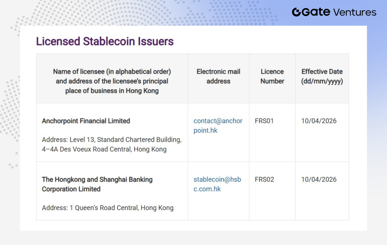 In terms of market rollout, the Hong Kong Monetary Authority has issued the first two stablecoin issuer licenses to HSBC Hong Kong and Anchorpoint Financial Limited—a joint venture between Standard Chartered, Animoca Brands, and HKT.(13)
