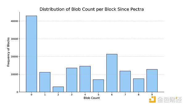 しかし、使用率が目標に達していないため、blob 手数料はまだ非常に低いレベルにあります。Pectra の立ち上げ以来の blob 分布データによると、40,000 以上のブロックには blob が含まれていませんが、約 52,000 のブロックには 6 つ以上の blob が含まれています。これは、さらに成長の余地があることを意味します。