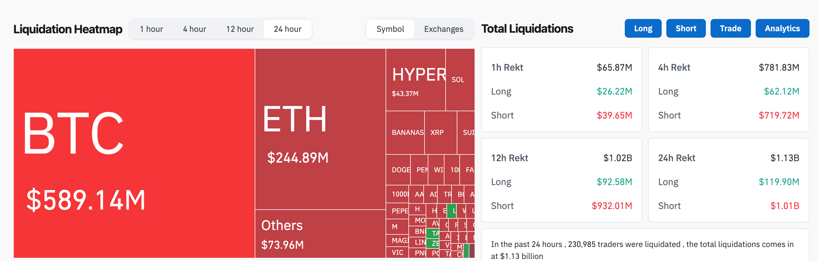 CoinGlassのデータによると、過去24時間以内に暗号資産デリバティブ取引所で大規模な清算(ロスカット)が発生し、世界中で23万人以上がロスカットされました。以下は重要なデータの概要です: