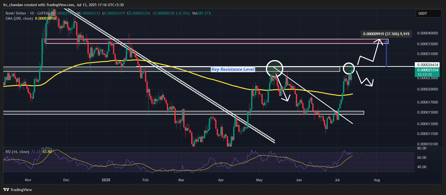 今回は、BONKが再び類似の下降トレンドラインを突破し、同じレベルに達しました。これにより、次のような疑問が生じました:歴史は繰り返されるのか、それともこの重要な抵抗ポイントを突破するのか?