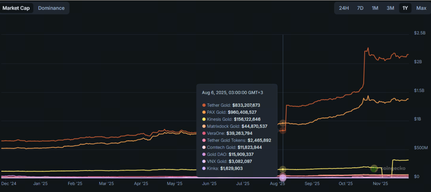 さらに、トークン化された金は小売投資家にとってより魅力的です。なぜなら、従来の金ETFには高額な手数料と最低投資額の制限があるからです。Tether GoldやPax Gold(PAXG)などのオンチェーンゴールドの市場供給量は2025年下半期に記録的な増加を見せ、それぞれ10億ドル未満から20億ドルと13億ドルに増加しました。その資金流入はステーブルコインと同程度であり、市場の認知度が高まっていることを示しています。