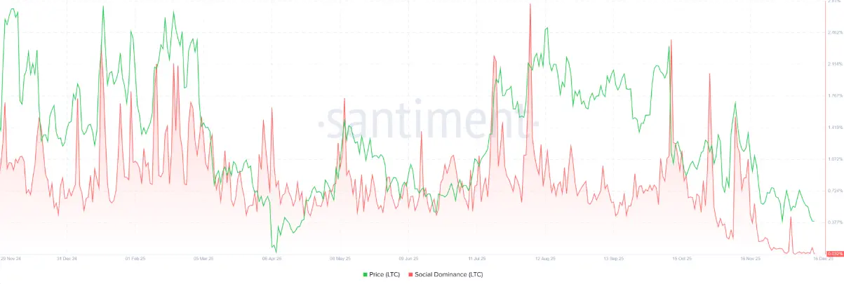 SantimentのSocial Dominance指数は、Litecoinに関して明確な下落トレンドを示しています。この指標は暗号通貨メディア上でのLTCに関する議論の比率を反映しており、12月初旬から継続的に弱含んでいます。火曜日には、今年最低の0.032%にまで低下し、市場のLitecoinに対する関心が冷え込みつつあることと、投資家の心理も慎重になっていることを示しています。