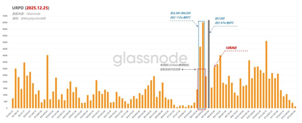 Murphyは、GlassnodeのURPD(UTXO実際価格分布)データを引用し、最近のスイッチと振動を経て、ビットコインは現在87,000ドルと84,500ドルの2つの価格帯において、他の価格帯よりも明らかに高い買い支えの積み重ねが見られ、「巨大な柱」を形成していると指摘しています。